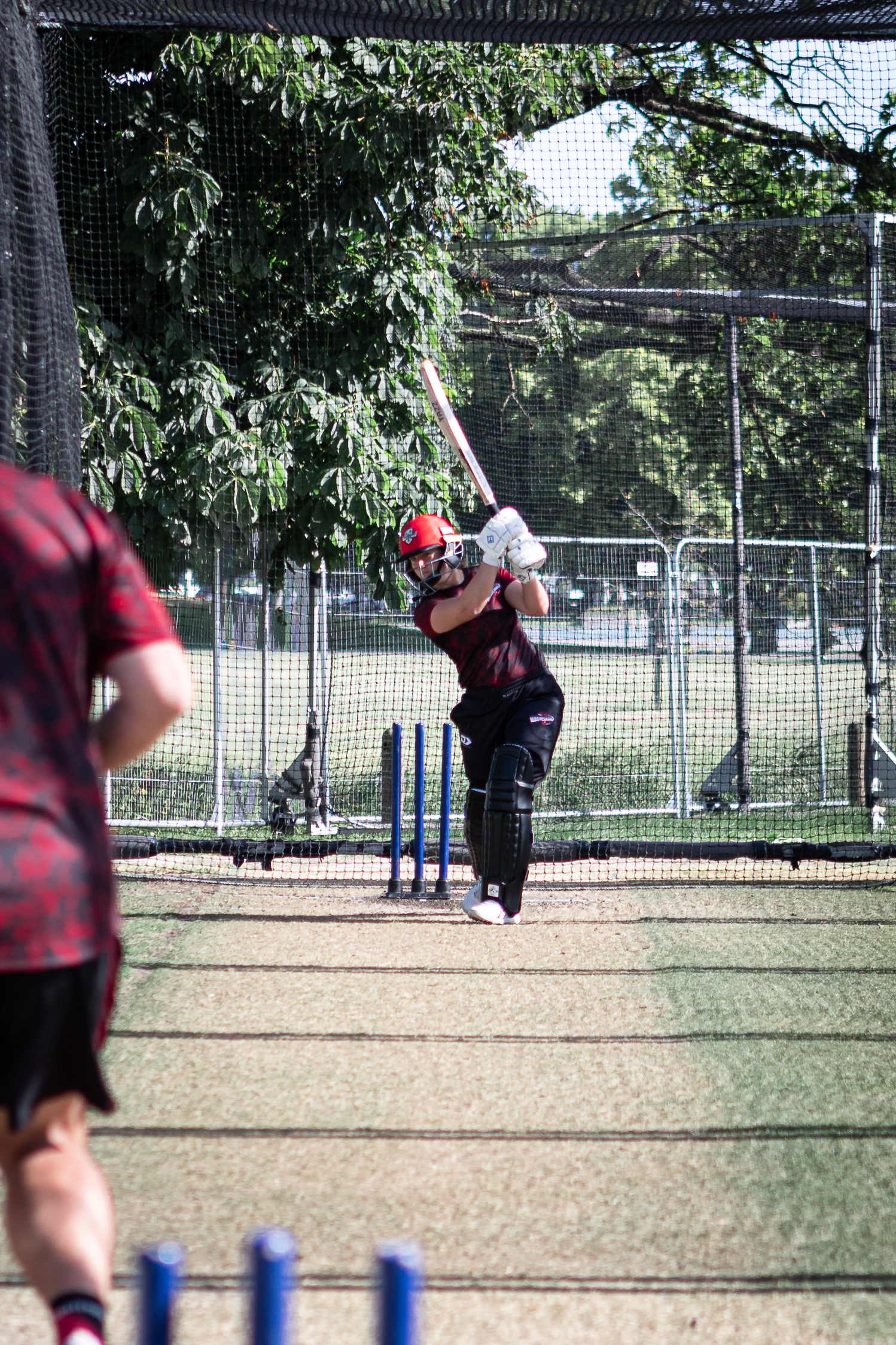Missy Banks find the middle of the bat in the nets behind Hagley Oval – image CCA