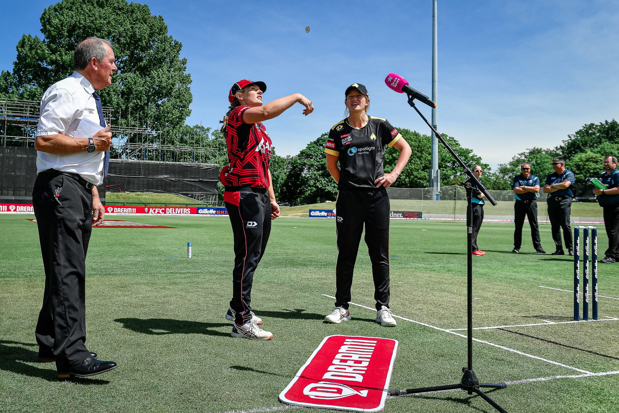 Frankie Mackay tosses the coin for the opening match of the Dream11 Super Smash – image photosportnz