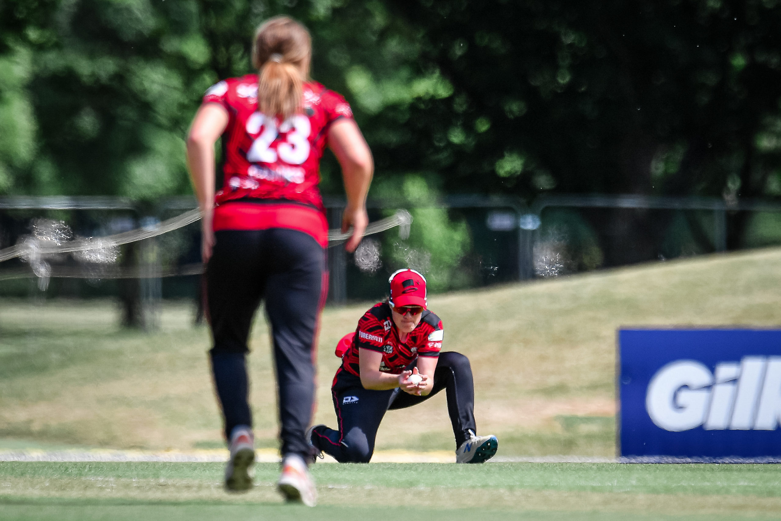 Jacinta Savage takes a comfortable catch off the bowling of Missy Banks at Hagley Oval – image photosportnz