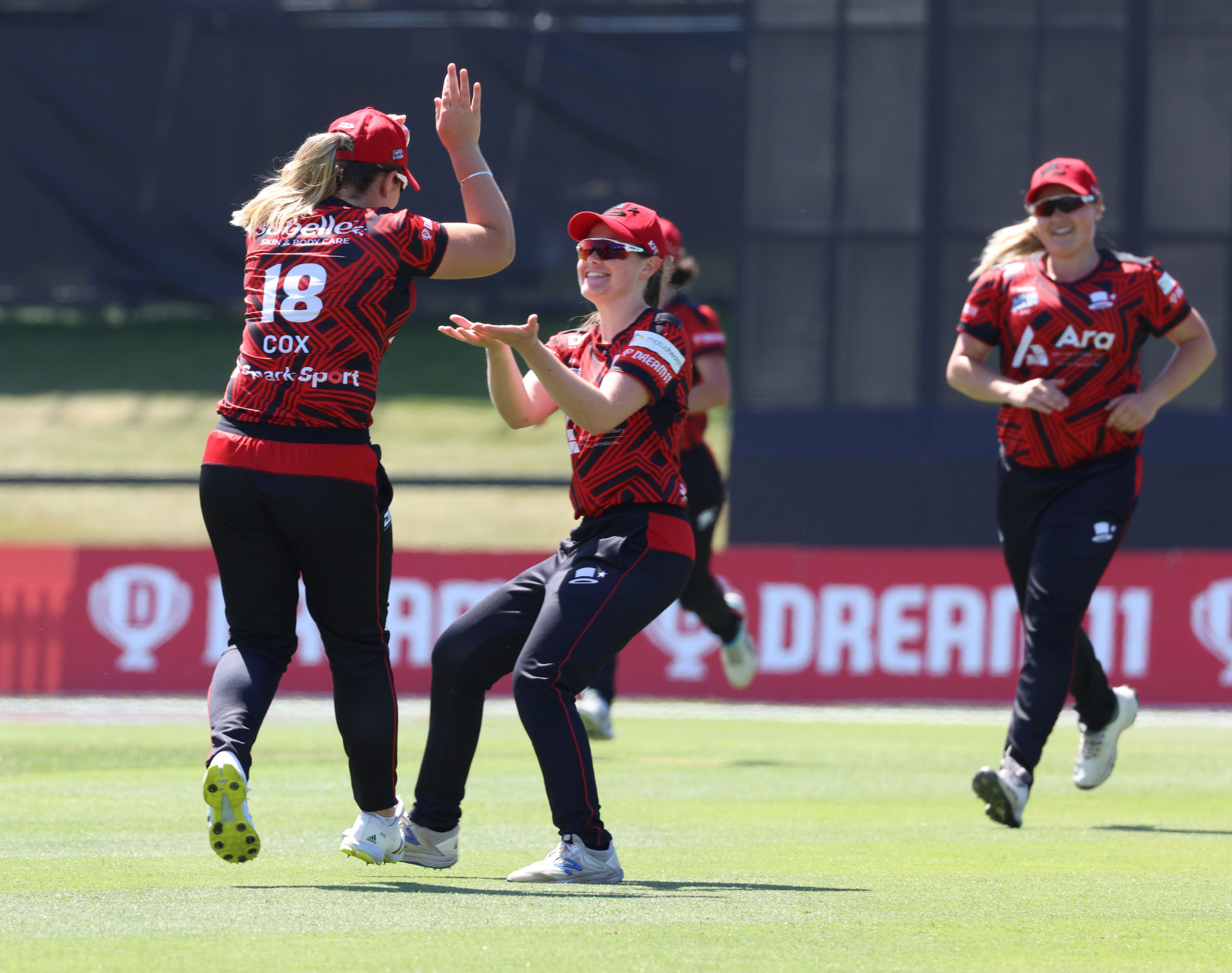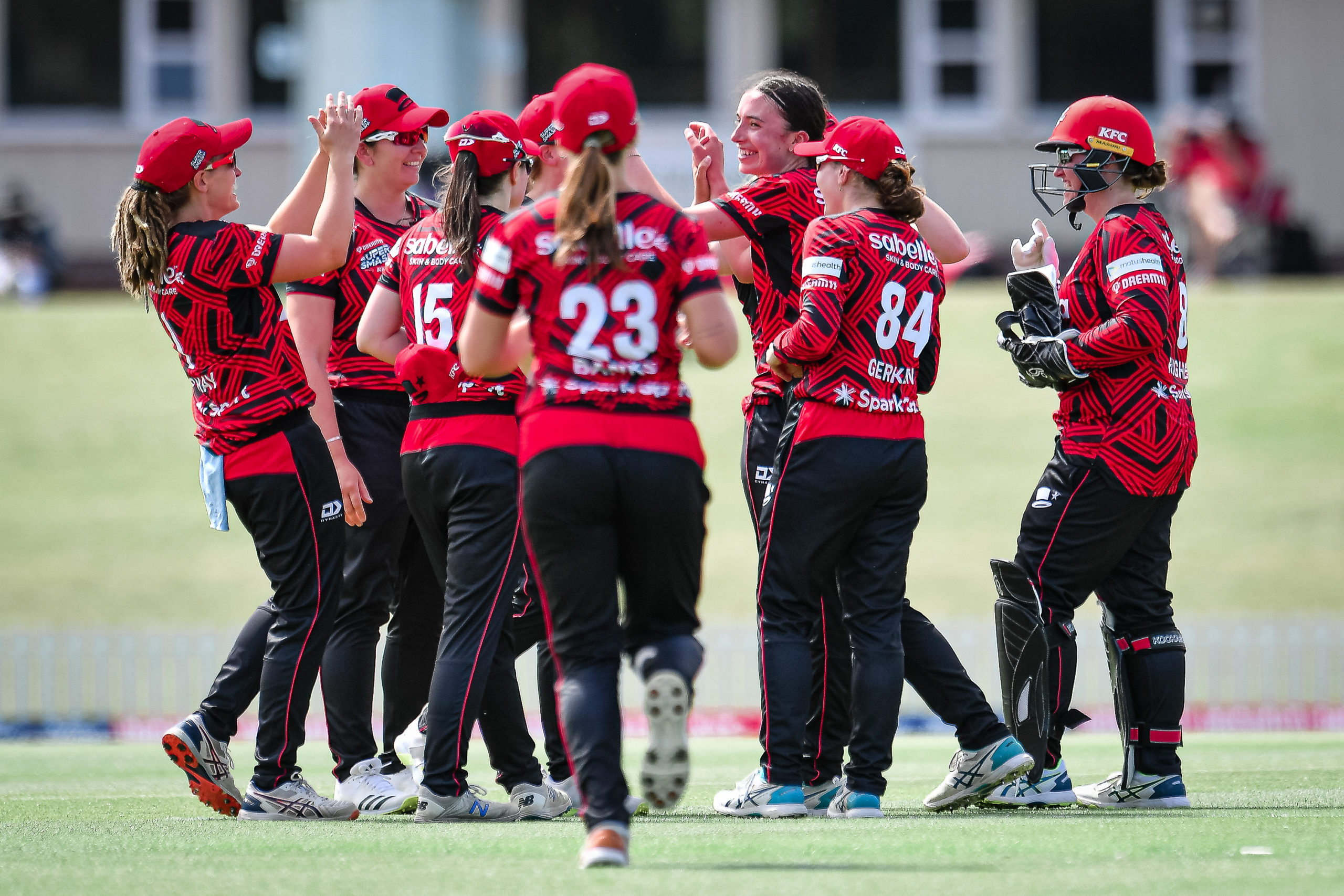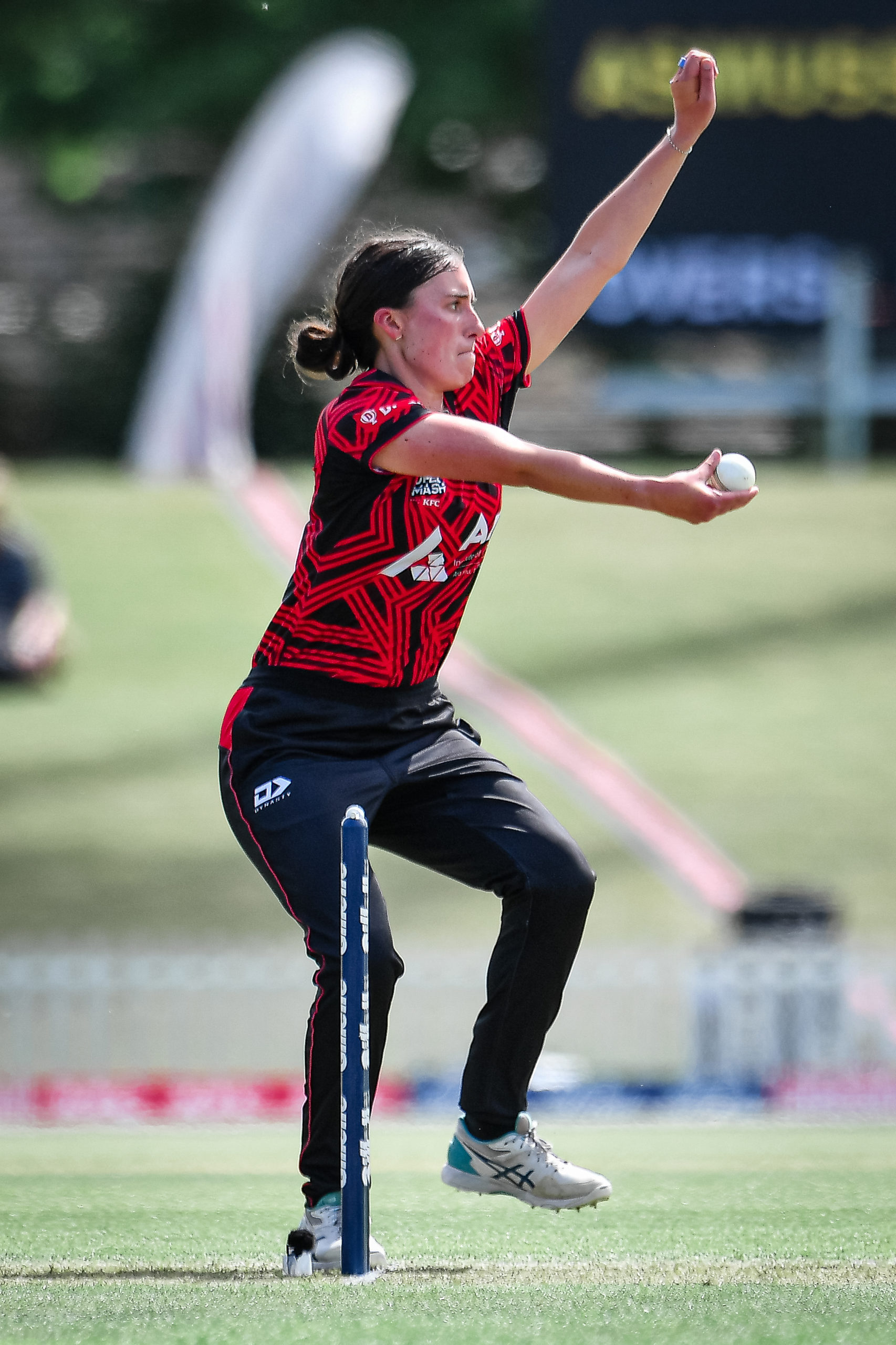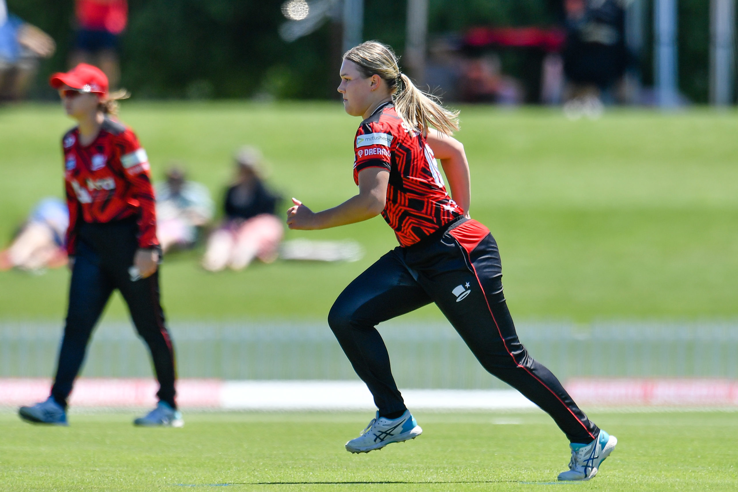 Canterbury MAGICIANS leg-spinner Sarah Asmussen celebrates a wicket – image photosportnz