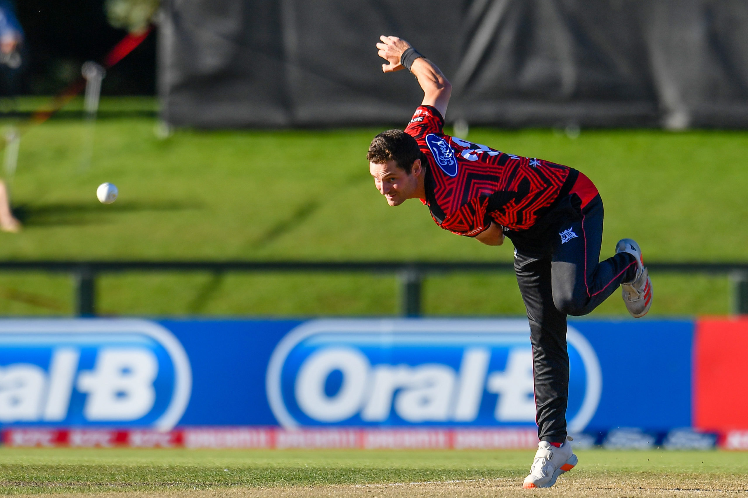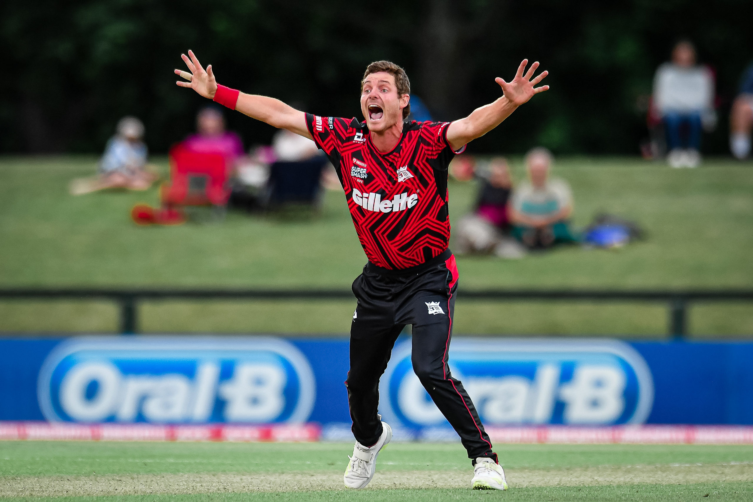 Edward Nuttall Appeals for an LBW in the Dream11 Super Smash. Nuttall finished the tournament with 15 wickets – image photosportnz