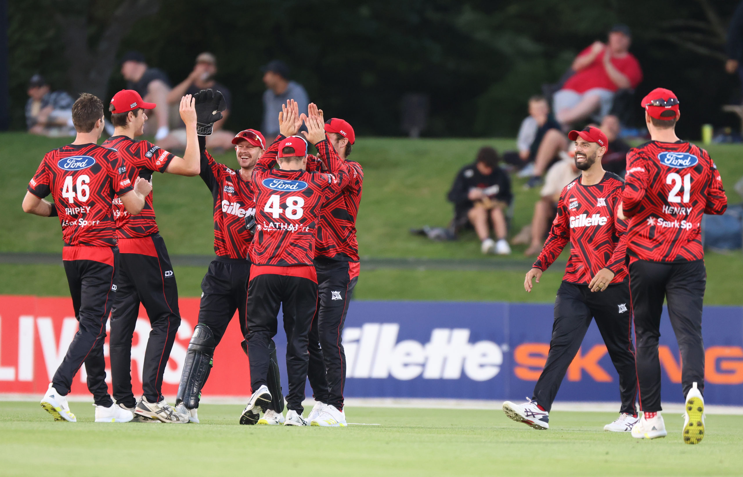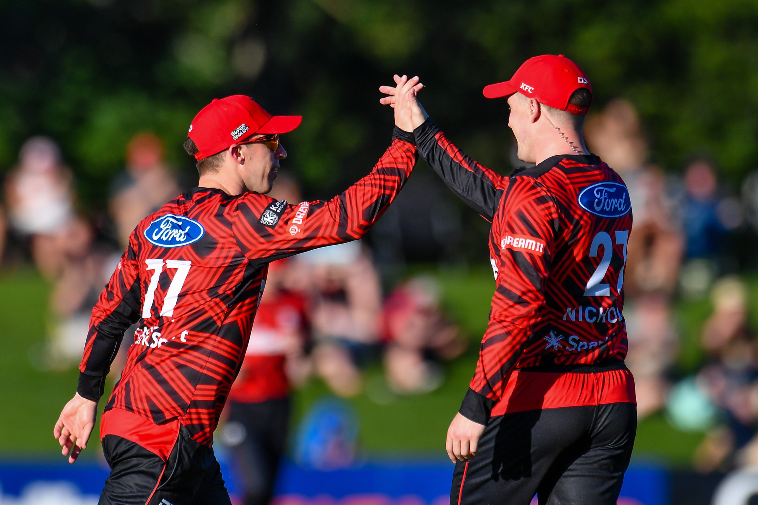 Henry Nicholls of Canterbury celebrates Leo Carter of Canterbury catch during the Super Smash T20 Cricket match, Canterbury Vs Otago Volts, at Hagley Oval, Christchurch, New Zealand, 26th December 2021. Copyright photo: John Davidson / www.photosport.nz