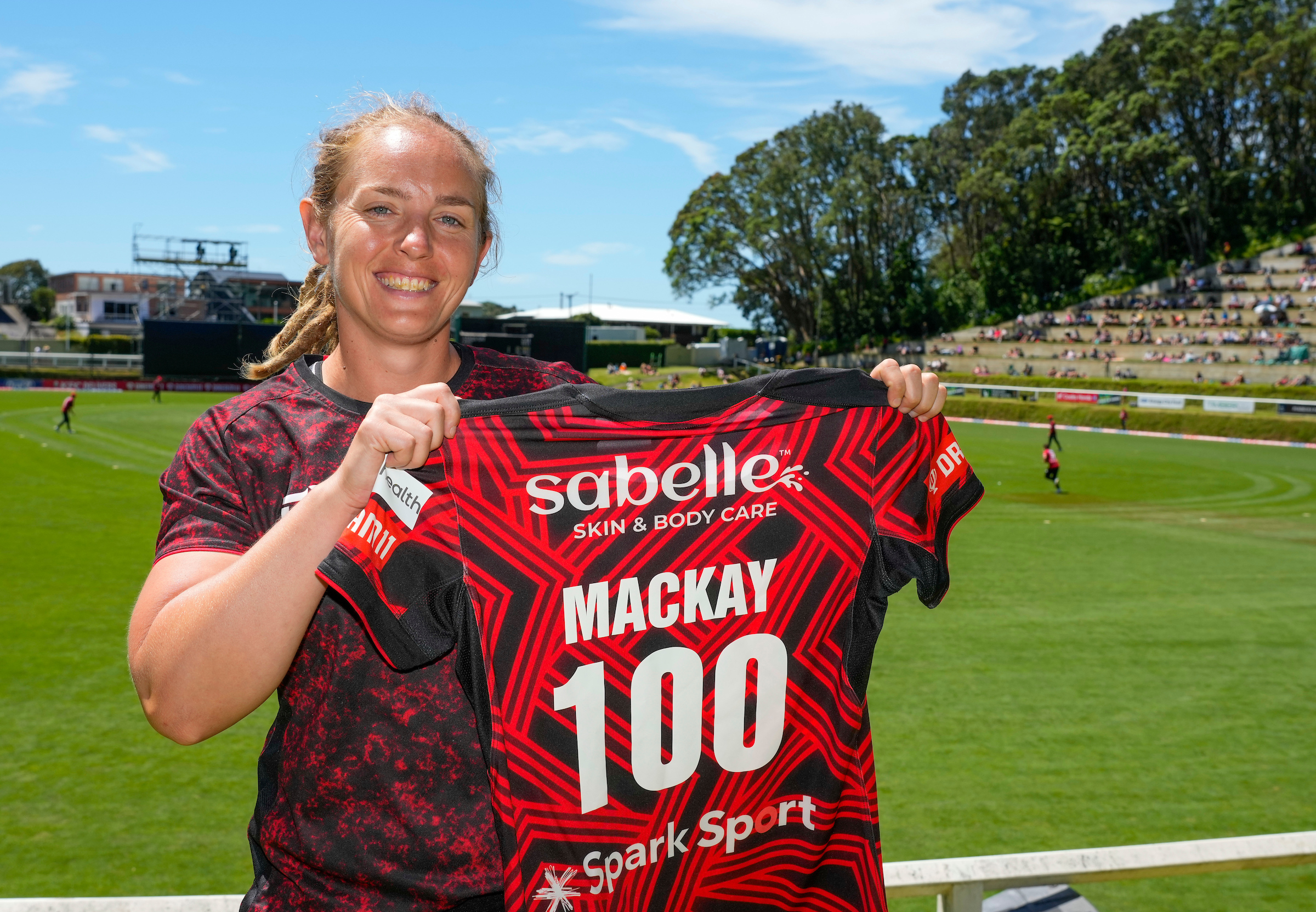Frankie Mackay with her 100th match shirt. image – photosportnz